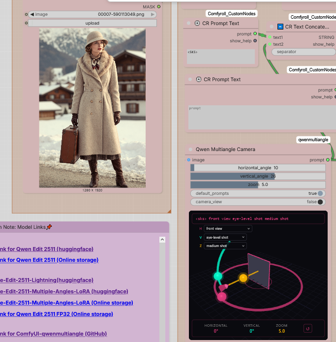Mais attention ! Le nœud donne l’impression que le modèle va calculer à l’angle exacte. En réalité, il s’agit juste d’une aide pour générer les commandes en anglais. Le LoRA propose 96 angles précis. Par exemple, il y a 3 niveaux de zoom : close-up, medium shot et wide shot. Autrement dit, vous ne pourrez pas spécifier un intermédiaire entre close-up et médium shot, même si le petit outil vous donne l’impression que c’est possible.