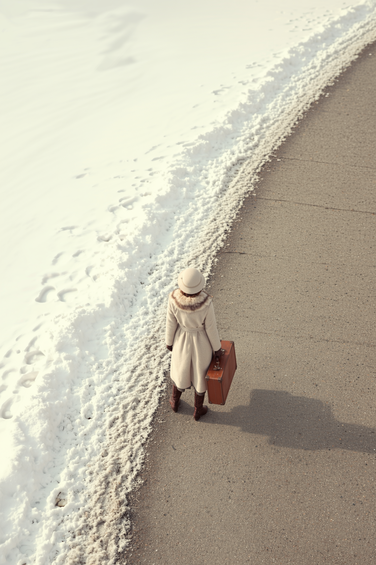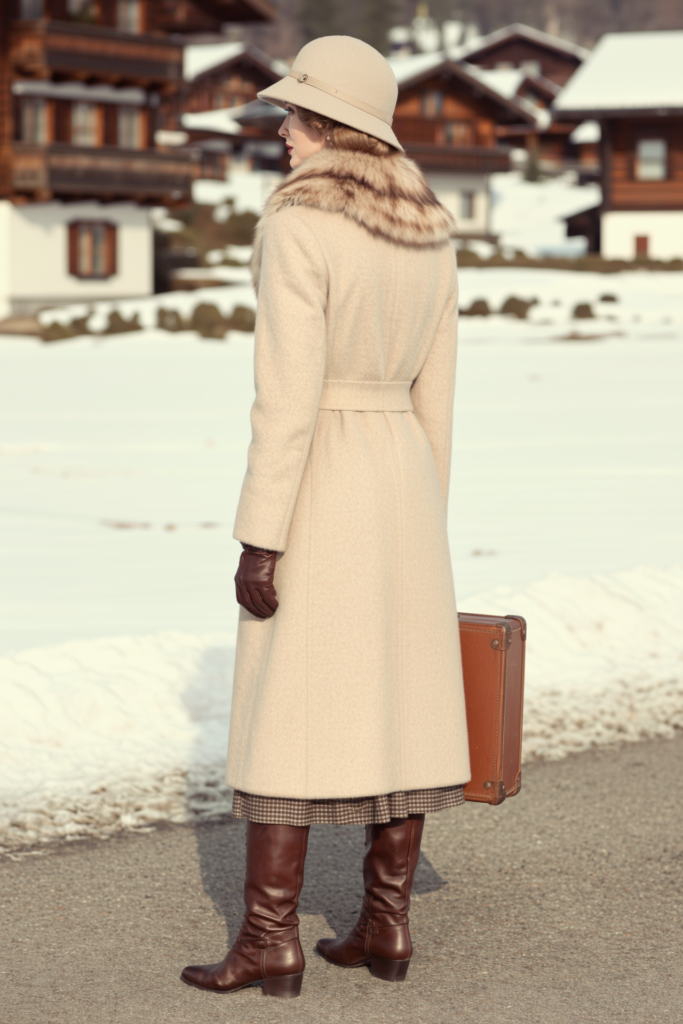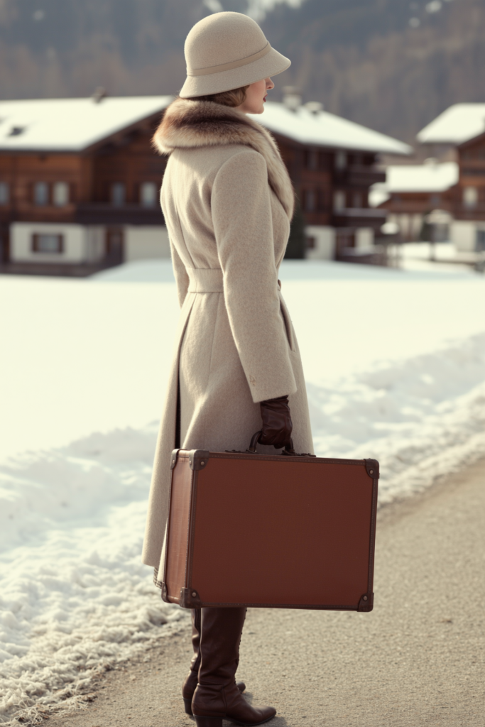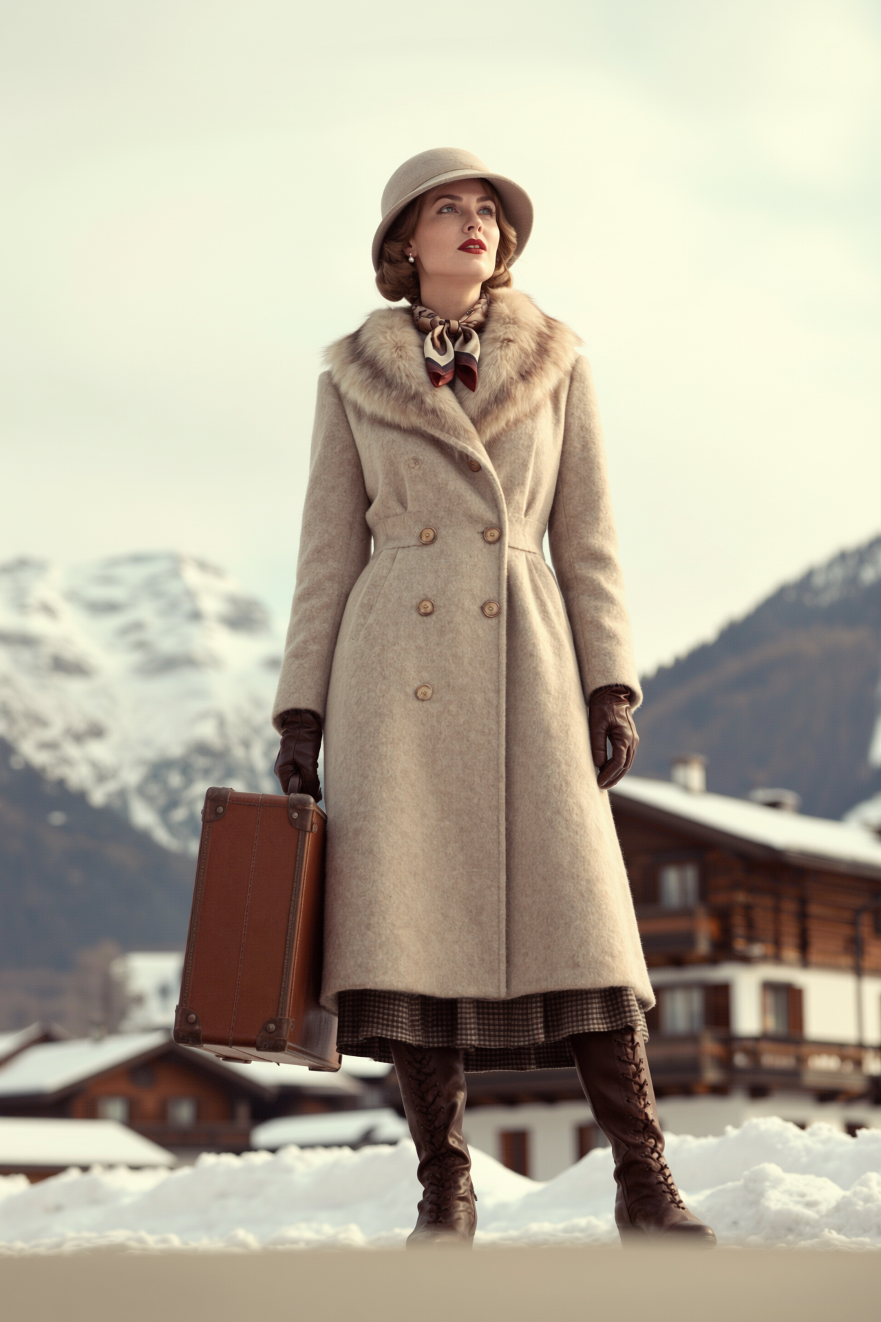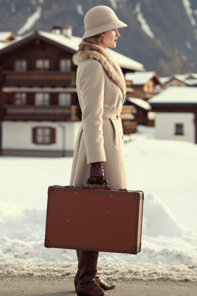 » full-body fashion photo of a chic 1920s alpine tourist woman, beautiful face, elegant confident pose. “Roaring Twenties” vibe, luxury winter travel style, tailored wool coat with fur collar, cloche hat, leather gloves, silk scarf, calf-length skirt, lace-up leather boots, small leather suitcase, subtle pearl jewelry, perfect grooming, natural makeup, high-end vintage editorial photography, Alpine mountains in the background, Swiss/Austrian alpine village near a grand hotel, crisp winter air, soft morning light, 35mm film look, realistic skin texture, shallow depth of field, sharp focus on subject, background slightly blurred . Alpine mountains in background. »